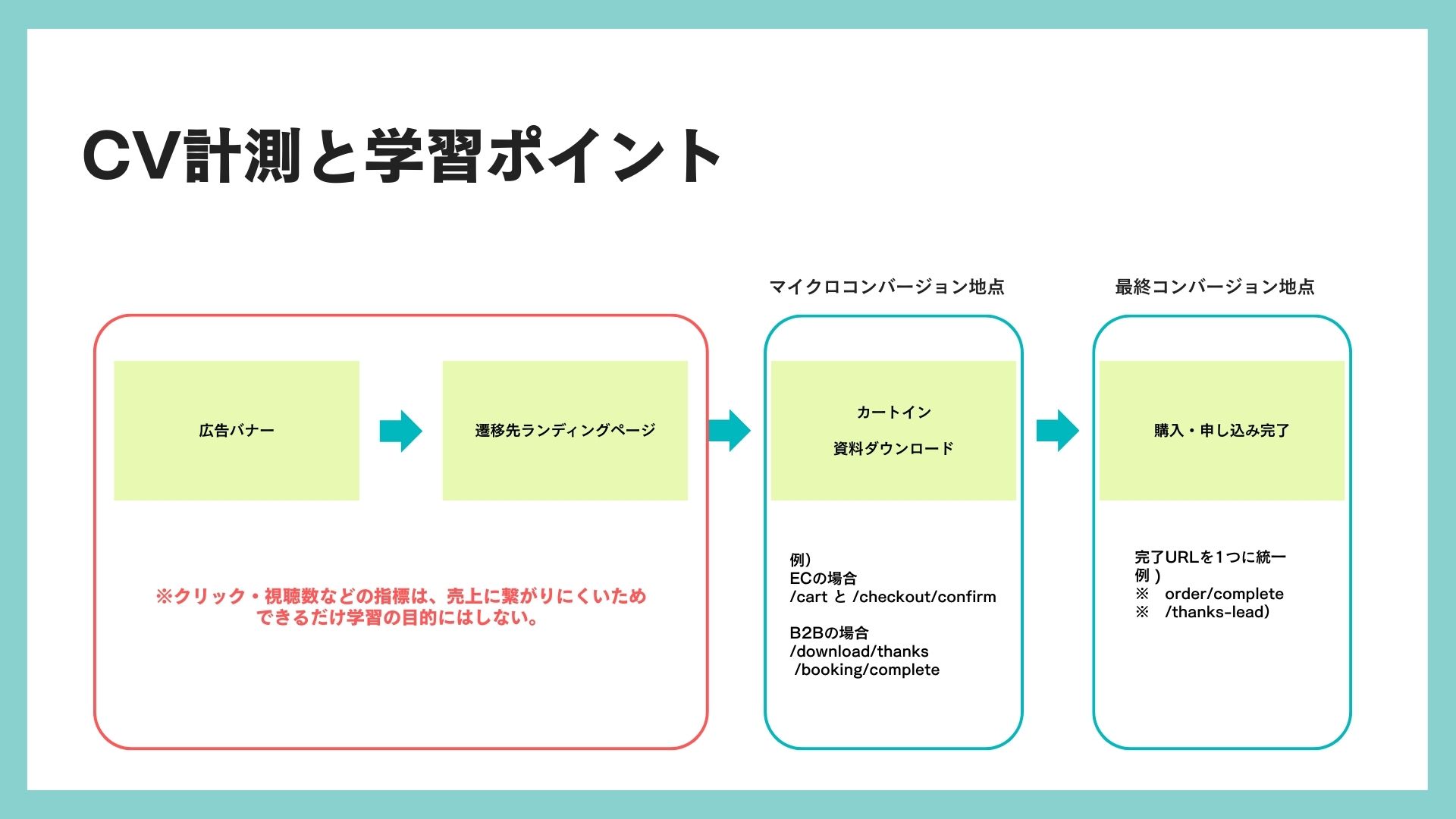 最初はシンプルに、完了ページのURLを一つに統一し、そのURLを条件にCVを作成します。次に、再読み込み、戻る操作、URL直打ちで成果数が増えないかを必ずテストし、重複カウントを防ぎます。あわせて、最終成果の手前にある行動の回数を示す中間指標(マイクロCV)は二つだけ設定します。ECなら「カート到達」「最終確認」、BtoB(企業間取引)なら「資料ダウンロード完了」「面談予約完了」などです。毎週、最終CVと中間二つが一緒に増減しているかを確認し、増えても最終成果が増えないことが多い中間指標は外します。