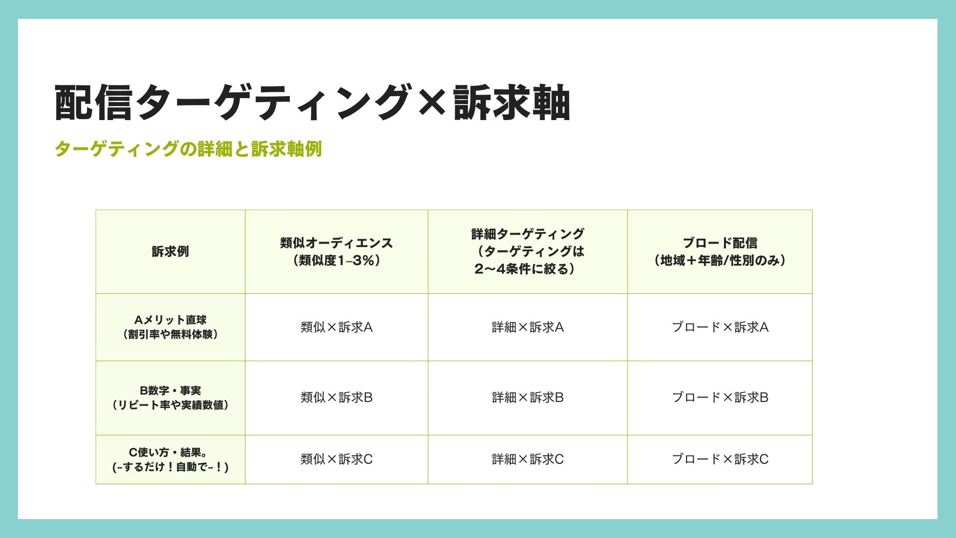 配信方法は三つに固定します。①類似オーディエンス(既存の成果データに近い傾向の人へ広げる方法)、②詳細ターゲティング(興味や行動などの条件で2~4項目に絞る方法)、③ブロード(条件を広くして配信し、広告側の調整に任せる方法)です。