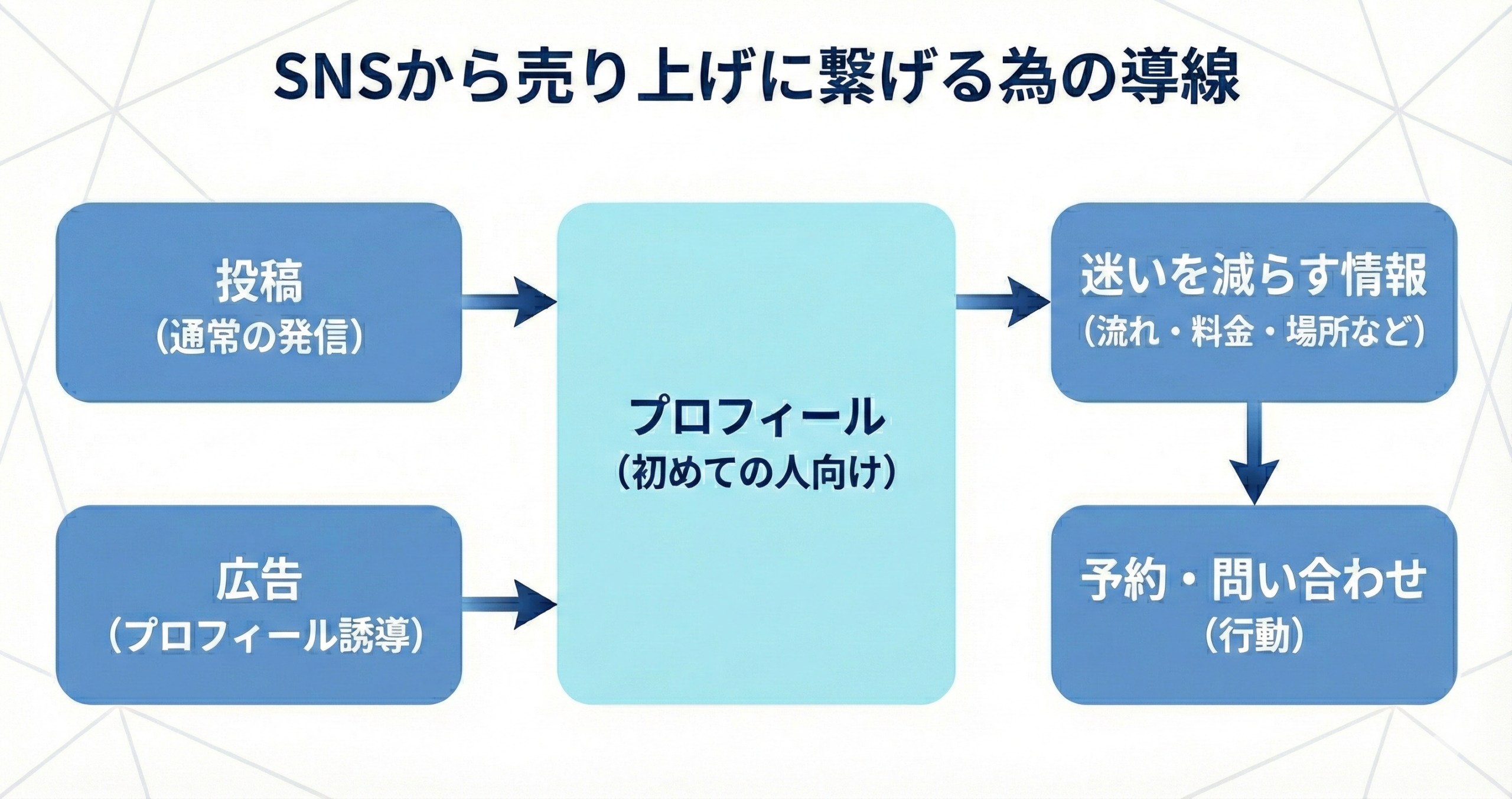 一方で、広告はそれだけで成果を保証するものではありません。広告で人を集めても、プロフィールや投稿内容が弱いと成果は出ません。広告経由の来訪者は判断が早く、プロフィールを開いて短時間で離脱しやすいからです。そこで広告を始める前に、受け皿を整えます。受け皿とは、初めて来た人が迷わず理解できる情報の置き場のことです。具体的には、プロフィール文と固定投稿です。ここが整うと、少フォロワーでも、広告を少額予算で回す運用でも、予約までの導線がつながりやすくなります。