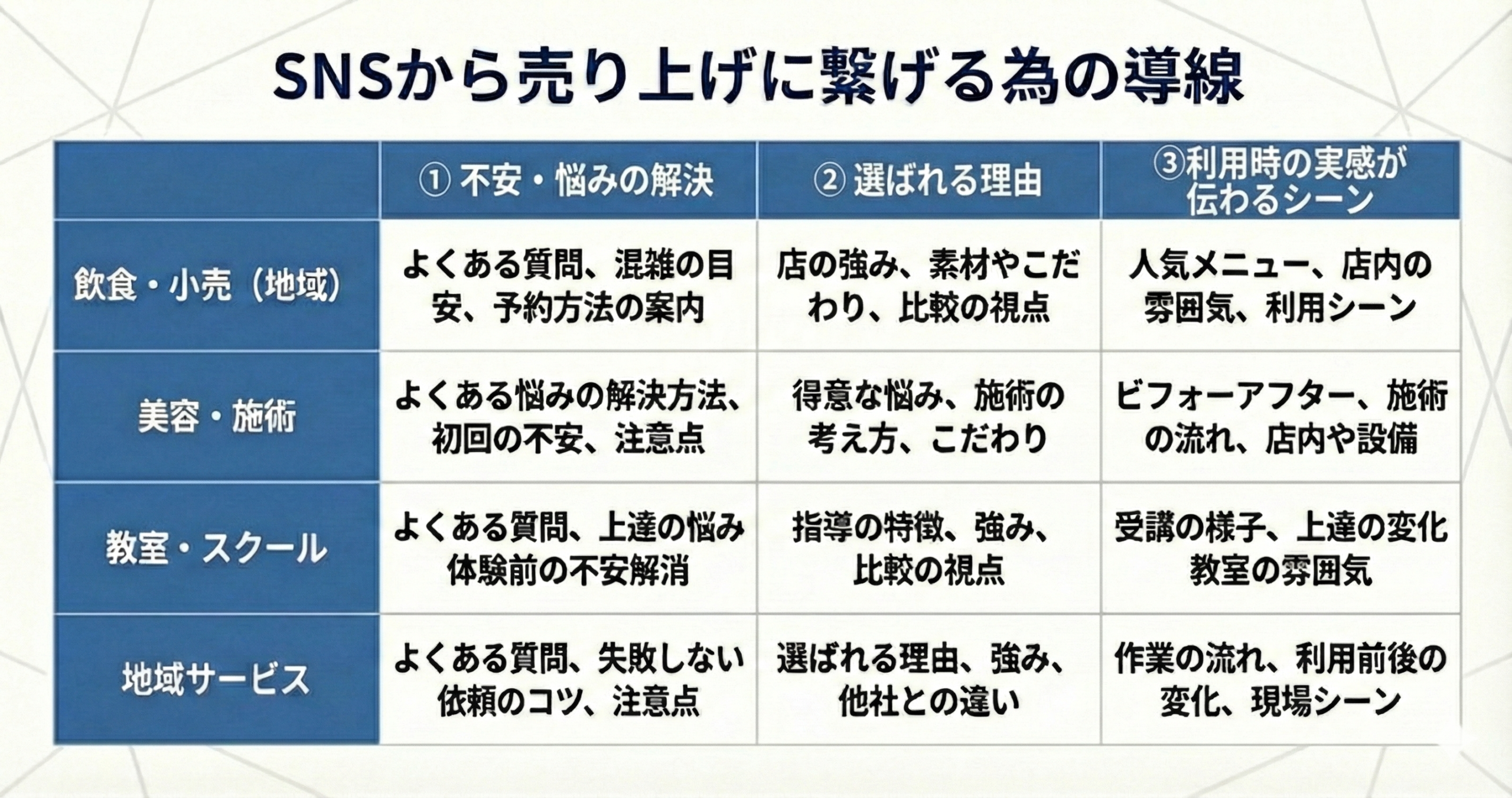 本稿でいうユーザーの迷いとは、興味は持ったのに予約や問い合わせの直前で止まってしまう具体的な疑問や不安のことです。例えば、自分が対象なのかが分からない。料金の幅が見えない。所要時間が分からない。担当者が誰か分からない。場所や駐車場が分からない。予約手段が見つからない。キャンセルの扱いが不明で不安。こうした一つ一つが、離脱の理由になります。逆に言えば、これらを先に言語化して提示できれば、フォロワー数が少なくても、少ない閲覧数の中から来店・予約が発生しやすくなります。